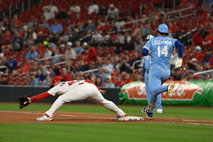 Willson Contreras of the St. Louis Cardinals makes the catch for an out against Jac Caglianone of the Kansas City Royals during the sixth inning at Busch Stadium on Tuesday. Caglianone went hitless in five plate appearances in his much anticipated big league debut. Photo Credit: Getty Images